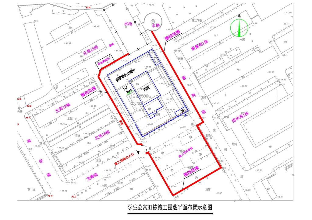新建学生公寓H1栋选址在原收发室位置,总建筑面积约15000平方米,楼高11层。施工计划于2020年12月30日进场围蔽(见施工围蔽平面图),施工工期约9个月,围蔽施工期间给师生,特别是周边居住的师生带来的不便敬请谅解。施工期间请大家根据现场交通指引通行,切勿进入施工现场。
